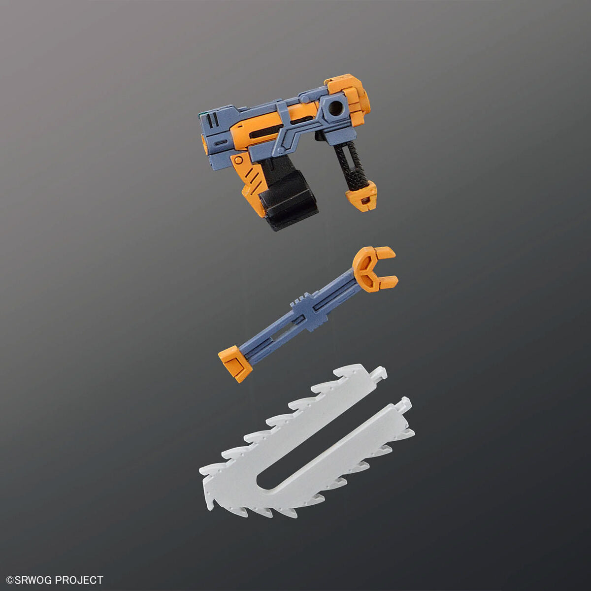 From the Super Robot Wars OG series, the High Grade Gunleon model expertly replicates its Magna Mode through detailed part replacement and transformation. This figure features an impressive arsenal, including the Riot Jarenti weapon extending to about 230 mm—surpassing the aircraft's total length—and a partially expandable Riot Jalench for Magna Mode conversion. Storage is thoughtfully designed with the Gieg Gun mounted on the variable rear boom and Decker Spanner secured on the legs. The model incorporates jewel seals for the red waist accents and plastic seals for the Chain Decutter’s black and orange elements. It also includes an Action Base 7 for versatile display options.