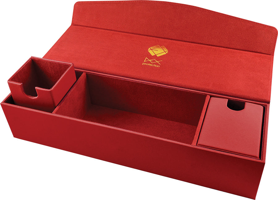 The Game Chest from Dex Protection is a unique way to conveniently and stylishly personalize how you store your games and collections. The Game Chest utilizes two conveniently located and fully removable trays in which to store tokens, dice, and other accessories or 100+double-sleeved cards. A main compartment provides players ample space for additional cards, accessories, and game components or 300+ double (360 single) sleeved cards. Additionally, the interior of The Game Chest is lavishly lined with a real suede interior. Each Game Chest utilizes an innovative exterior material which provides a stylish matte finish without sacrificing durability or protection. 14 extra strength magnets provide an insane closure to hold components securely in place. The Game Chest is a perfect storage solution for many CCGs, LCGs, and board games.